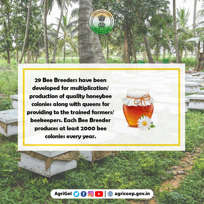 29 Bee Breeders have been developed for multiplication/production of quality honeybee colonies along with queens for providing to the trained farmers/beekeepers. Each Bee Breeder produces at least 2000 bee colonies every year.