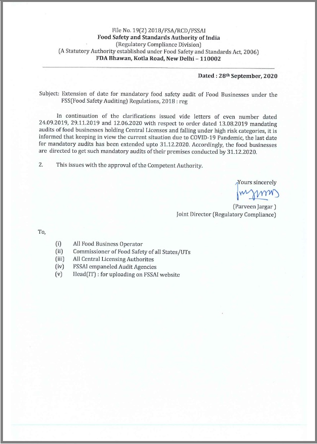 Extension of date for mandatory food safety audit of Food Businesses under the FSS(Food Safety Auditing) Regulations, 2018