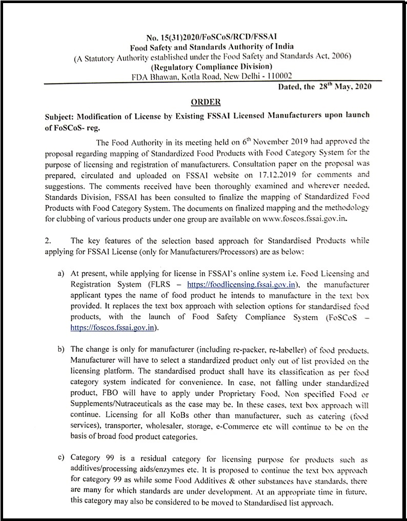 FSSAI launched Food Safety Compliance System (FoSCoS) wef 01st June 2020 replacing existing Food Licensing and Registration System.