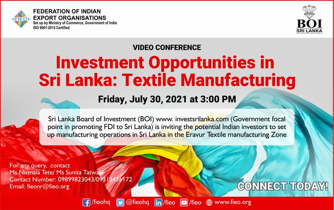 (Government focal point in promoting FDI to Sri Lanka) is inviting potential Indian investors to set up manufacturing operations in Sri Lanka in the Eravur Textile Manufacturing Zone.