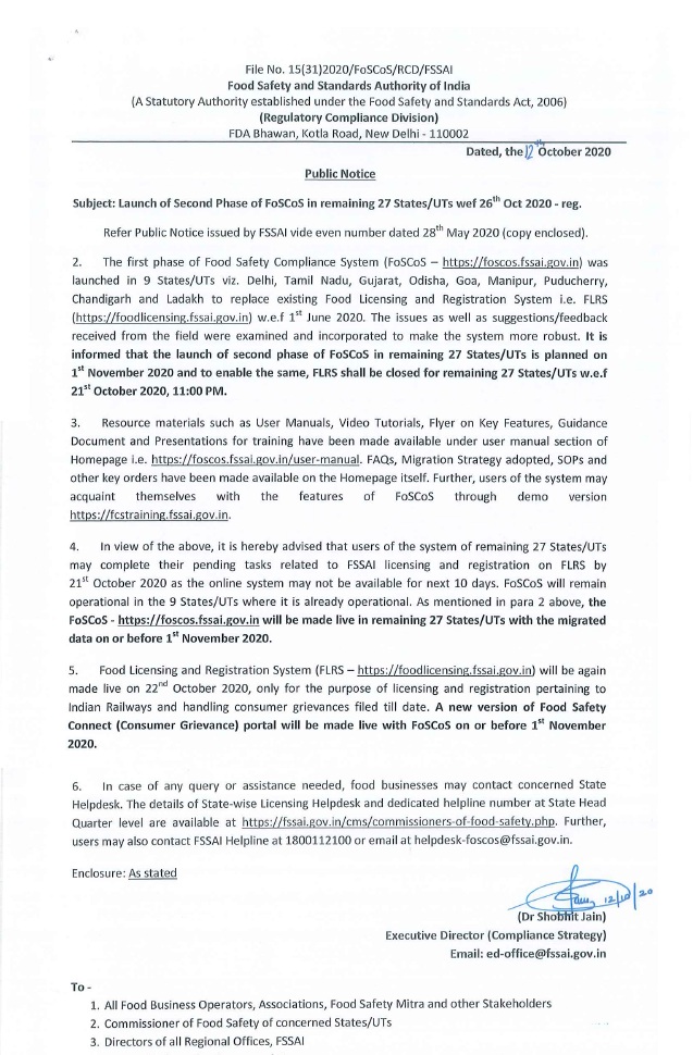Public Notice: Launch of second phase of FoSCoS in remaining 27 states/UT's w.e.f. 26th Oct, 2020