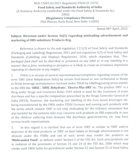 Subject : Direction under Section 16(5) regarding misleading advertisement and marketing of ORS substitute Production